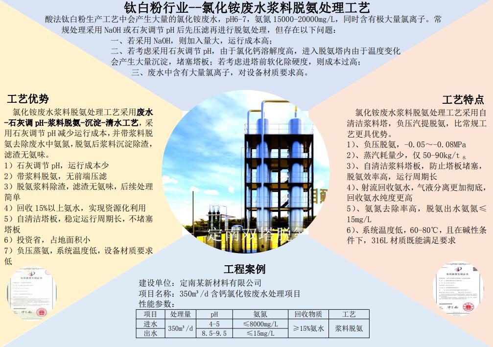 產(chǎn)品描述:酸法鈦白粉生產(chǎn)工藝中會(huì)產(chǎn)生大量的氯化銨廢水,pH6-7,氨氮15000-20000mg/L,同時(shí)含有極大量氯離子。常 規(guī)處理采用NaOH或石灰調(diào)節(jié)pH后先壓濾再進(jìn)行脫氨處理,但存在以下問題: 一、若采用NaOH,則加入量大,運(yùn)行成本高; 二、若考慮采用石灰調(diào)節(jié)pH,由于氯化鈣溶解度高,進(jìn)入脫氨塔內(nèi)由于溫度變化 會(huì)產(chǎn)生大量沉淀,堵塞塔板;若考慮進(jìn)塔前軟化除硬度,則成本過高; 三、廢水中含有大量氯離子,對(duì)設(shè)備材質(zhì)要求高。 聯(lián)系方式:13861506889李工