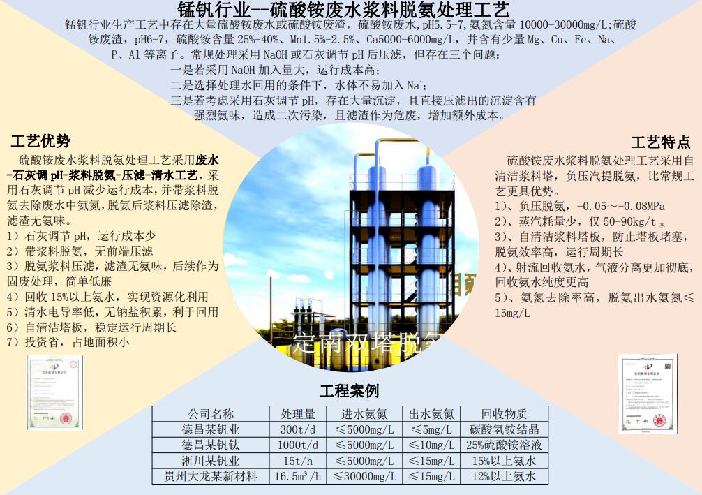 產(chǎn)品描述:錳釩行業(yè)生產(chǎn)工藝中存在大量硫酸銨廢水或硫酸銨廢渣,硫酸銨廢水,pH5.5-7,氨氮含量10000-30000mg/L;硫酸 銨廢渣,pH6-7,硫酸銨含量25%-40%、Mn1.5%-2.5%、Ca5000-6000mg/L,并含有少量Mg、Cu、Fe、Na、 P、Al等離子。常規(guī)處理采用NaOH或石灰調(diào)節(jié)pH后壓濾,但存在三個(gè)問題: 一是若采用NaOH加入量大,運(yùn)行成本高; 二是選擇處理水回用的條件下,水體不易加入Na+; 三是若考慮采用石灰調(diào)節(jié)pH,存在大量沉淀,且直接壓濾出的沉淀含有 強(qiáng)烈氨味,造成二次污染,且濾渣作為危廢,增加額外成本。聯(lián)系方式:13861506889李工